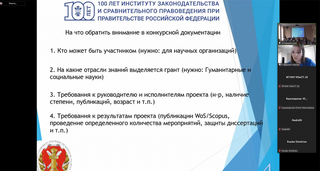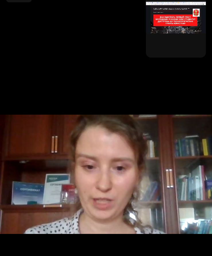 С открывающим докладом выступила Токарева Мария Сергеевна - заместитель заведующего отделом научных договорных работ Института законодательства и сравнительного правоведения при Правительстве Российской Федерации. В своем выступлении ария Сергеевна рассказала о возможности участия молодых ученых-юристов и студентов Института в конкурсах на получение грантов на проведение исследований, таких как гранты Президента Российской Федерации, гранты Министерства науки и высшего образования Российской Федерации, Российского научного фонда и Правительства Москвы. Она указала на актуальные гранты, в которых могли бы принять участие молодые ученые, магистранты и аспиранты Института в мае-июле 2022 г., а также провела мастер-класс по подготовке заявки на участие в конкурсе, разъяснив все этапы этого процесса: от создания заявки и ее заполнения до проверки и отправки грантодателю. Кроме того, в докладе были указаны наиболее распространенные ошибки при подаче заявок на участие в конкурсе, а также даны рекомендации по их недопущению.