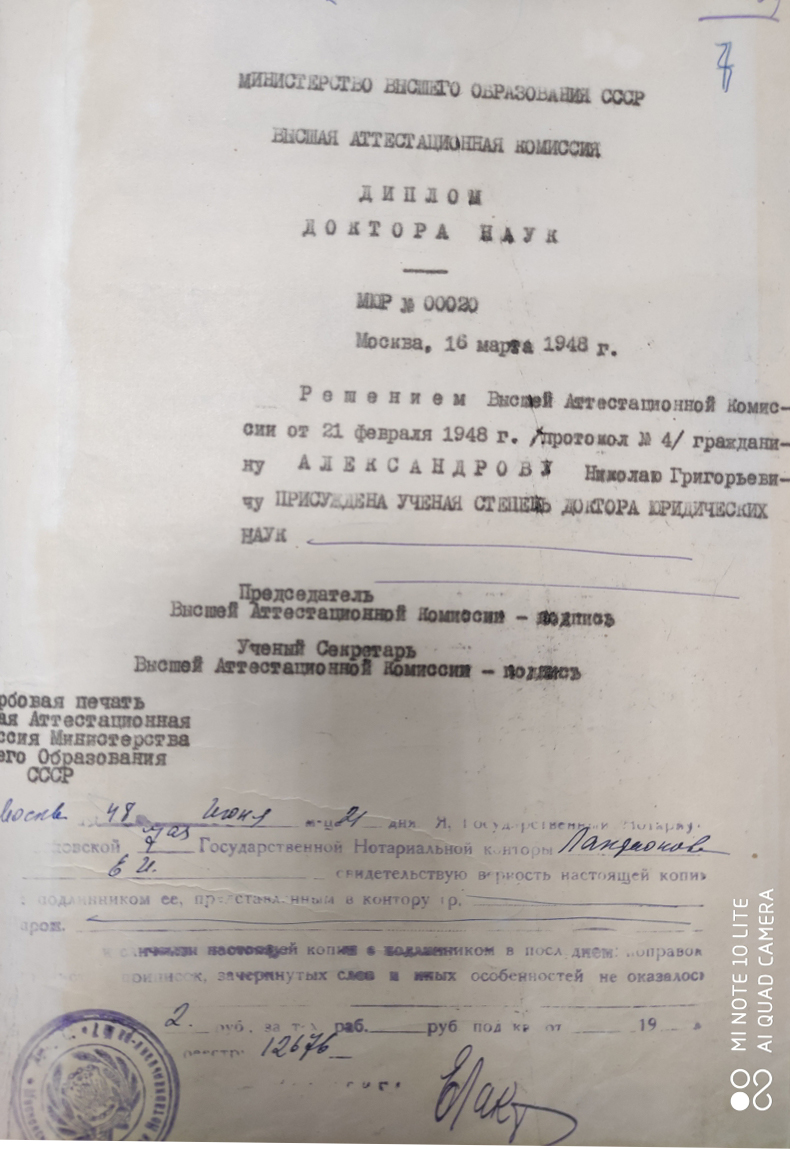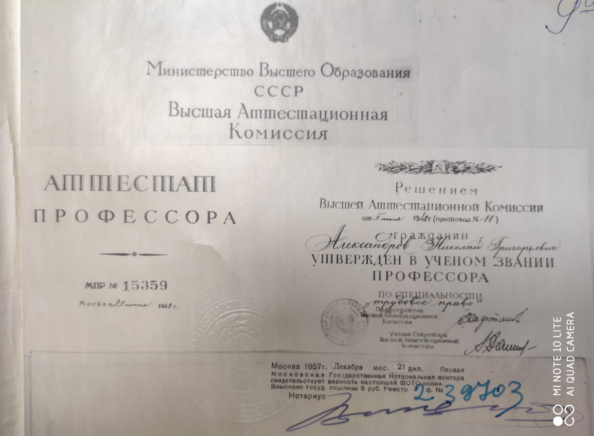 Николай Григорьевич Александров (1908—1974) – выдающийся ученый-правовед. В 1929 г. окончил факультет советского права в Московском государственном университете. К моменту завершения учебы Николай Григорьевич был уже не только подающим надежды молодым юристом, но и известным музыкантом, замечательным скрипачом и дирижером. Одновременно с занятием юриспруденцией он дирижировал в Театре оперетты и даже думал об артистической карьере.