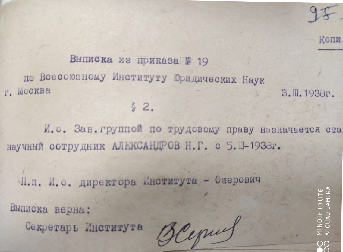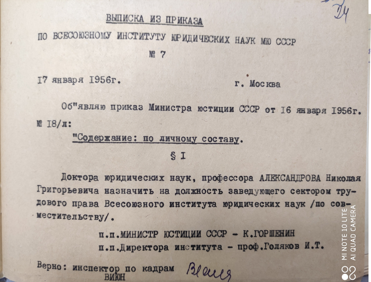 В 1936 г. Н.Г. Александрова назначили заведующим сектором трудового права Всесоюзного института юридических наук (ВИЮН). В этой должности он оставался до 1952 г., одновременно с 1946 по 1952 гг. являясь заместителем директора Института по научной части.