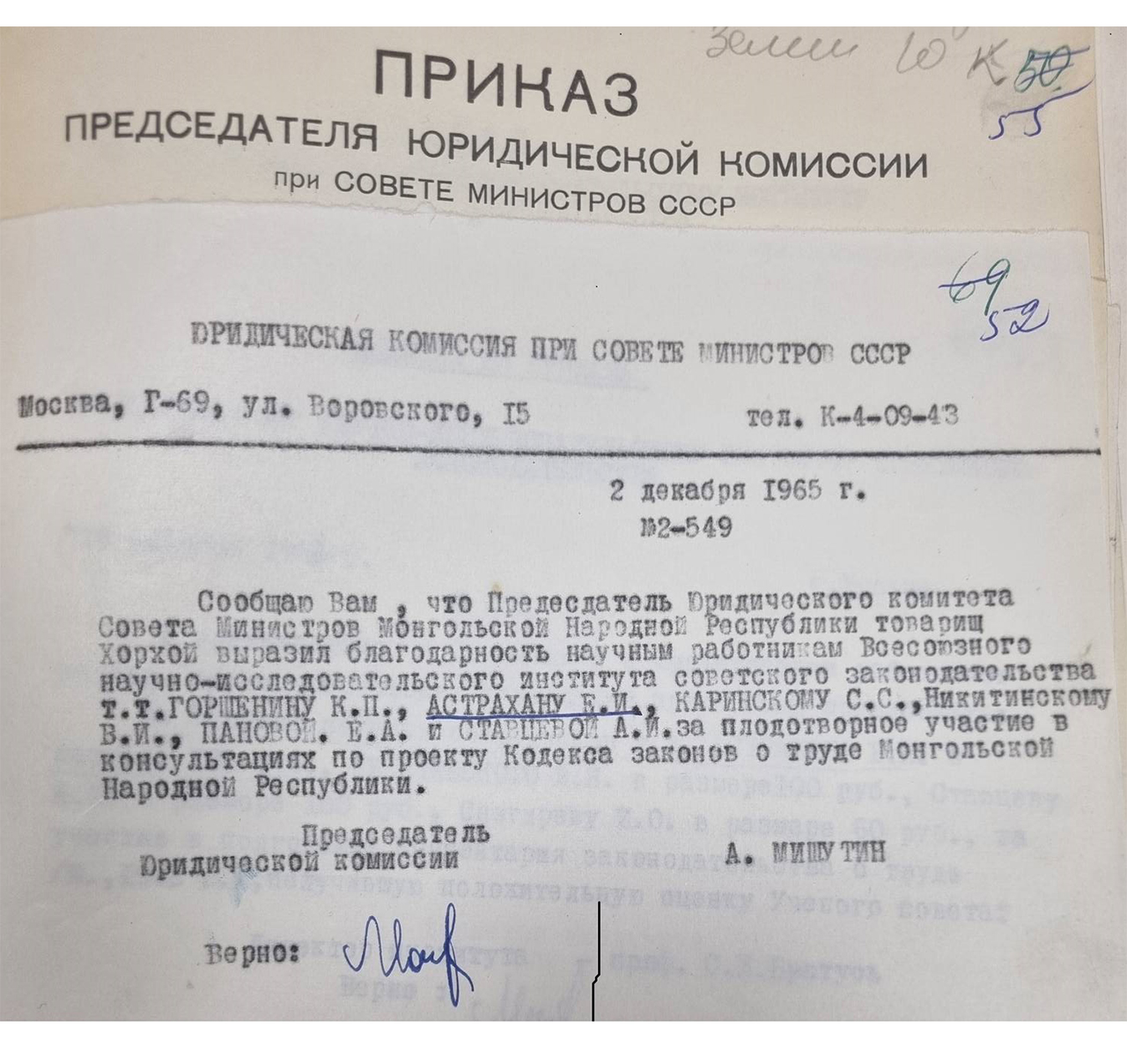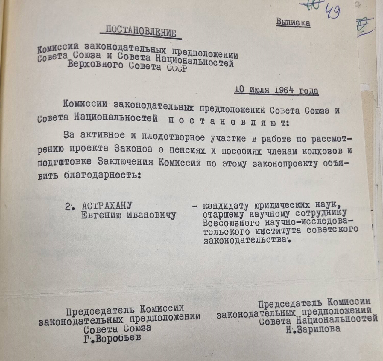 Почти 35 лет, с 1941 по 1975 год, старшим научным сотрудником в секторе законодательства о труде и социальном обеспечении Института работал Евгений Иванович Астрахан (1897–1975). Обладая блестящей памятью и прекрасным образованием, Евгений Иванович был исключительно доброжелателен, щедро делился своими знаниями и опытом. К нему без стеснения мог обратиться любой сотрудник за помощью и советом. Это был интеллигентный человек, тактичный, деликатный.