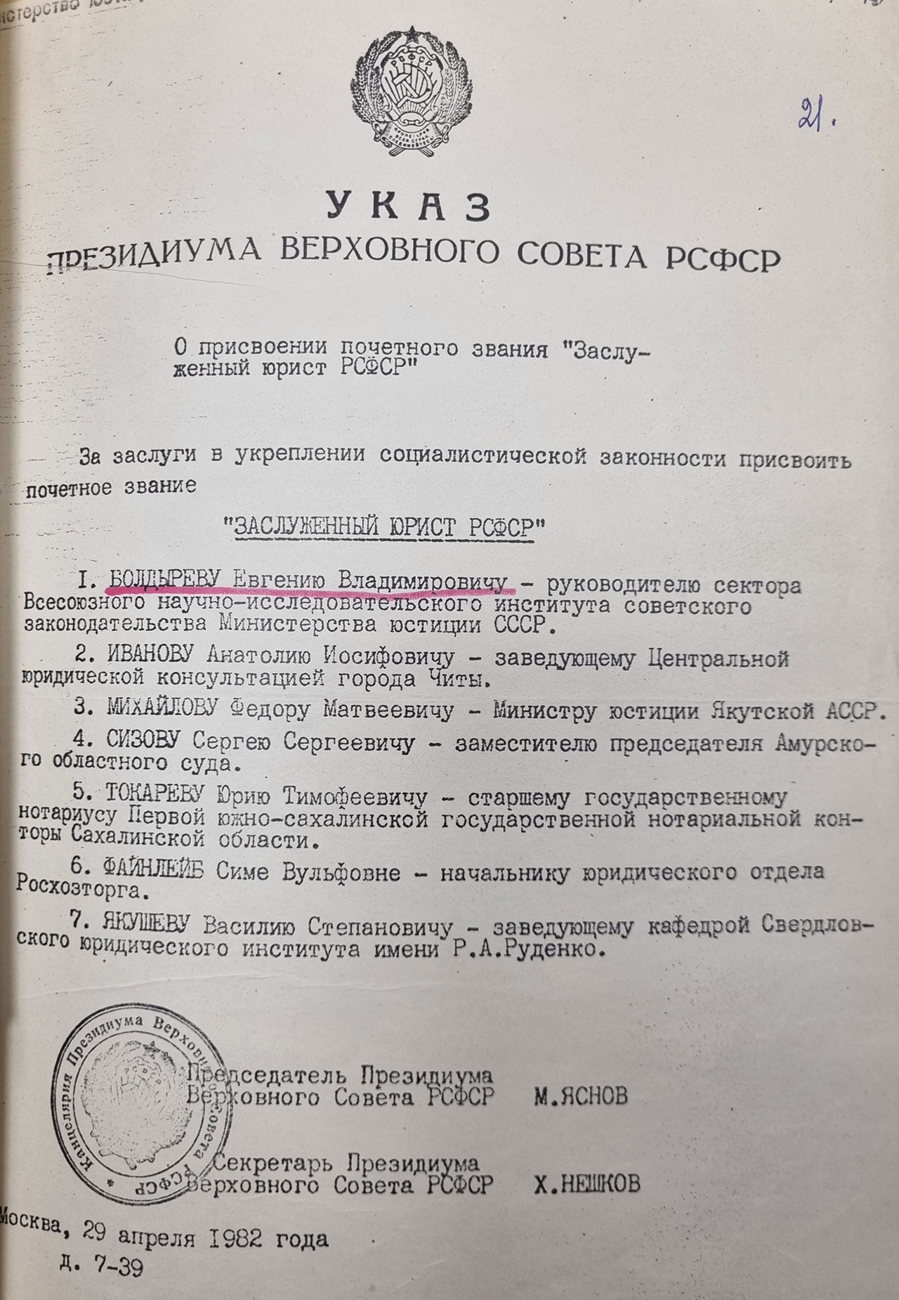 Профессору Е. В. Болдыреву было присвоено почетное звание «Заслуженный юрист РСФСР».