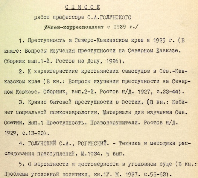 Голунский Сергей Александрович, начал свой научный путь в 1926 г. в Северо-Кавказском филиале Института, являясь старшим помощником Северо-Кавказского краевого прокурора. В 1926-1927 гг. в Голунским С.А. были подготовлены работы: «Сравнительный очерк преступности Северо-Кавказского Края в довоенные, военные, переходные, голодные годы и в настоящее время», «Кровосмешение и советское право», «Вменяемость в праве вообще и в советском праве в частности»; в 1928-1929 гг. – «Статистические данные о прошедших через Кабинет, правонарушениях» (в соавт. с В.В. Браиловским), «Уголовный элемент в гражданско-правовых взаимоотношениях хозорганов с частными лицами», «Кражи в рабочих кварталах Ростова-на-Дону»1.