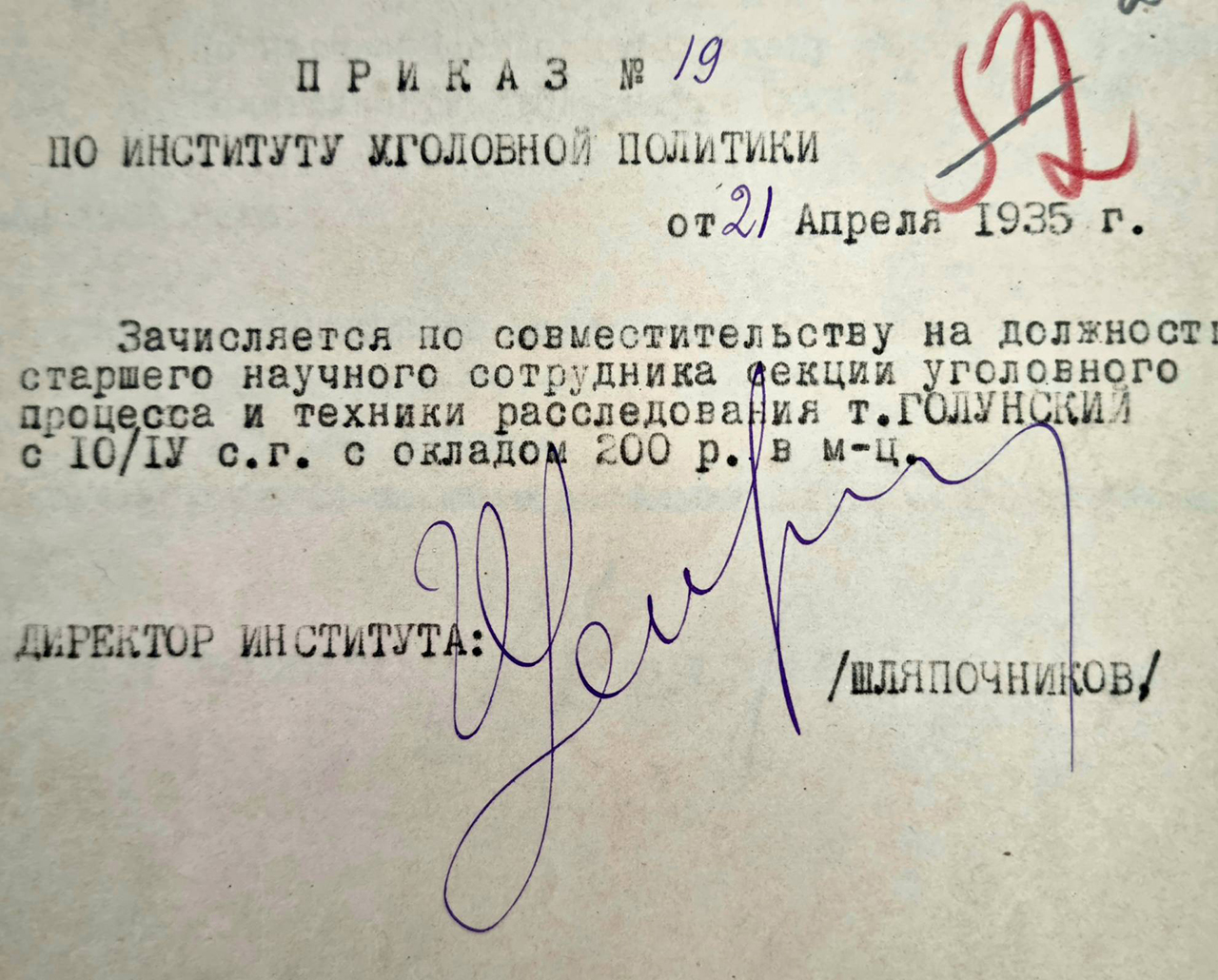 Приказ по Институту от 21 апреля 1935 г. № 19 о зачислении по совместительству на должность старшего научного сотрудника секции уголовного процесса и техники расследования С.А. Голунского.
