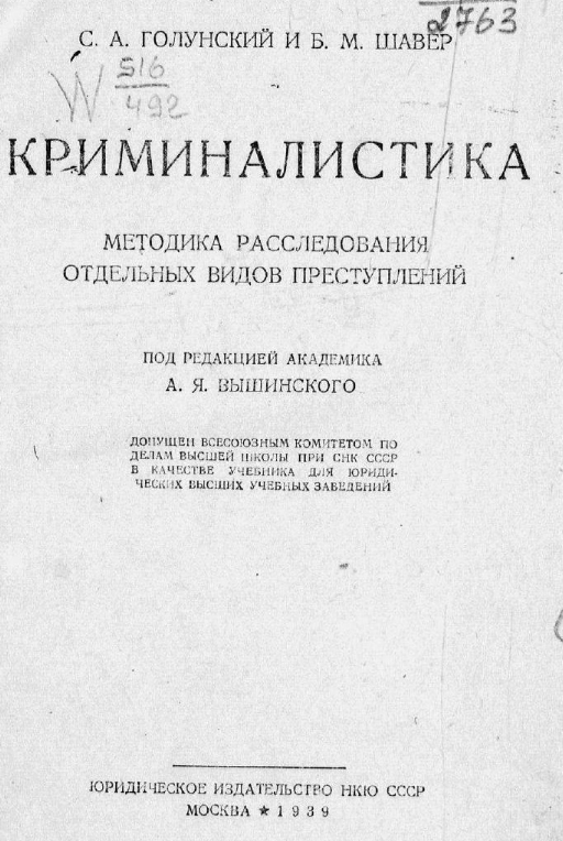 Голунский С. А., Шавер Б.М. Криминалистика. Методика расследования отдельных видов преступлений: Учебник / под ред.: Вышинского А.Я. М., 1939