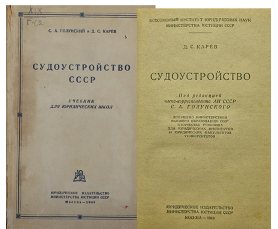 Карев Д. Судоустройство / Под ред члена-корреспондента АН СССР С. А. Голунского. Всесоюзный институт юридических наук Министерства юстиции СССР. - Москва : Юрид. изд-во, 1948.